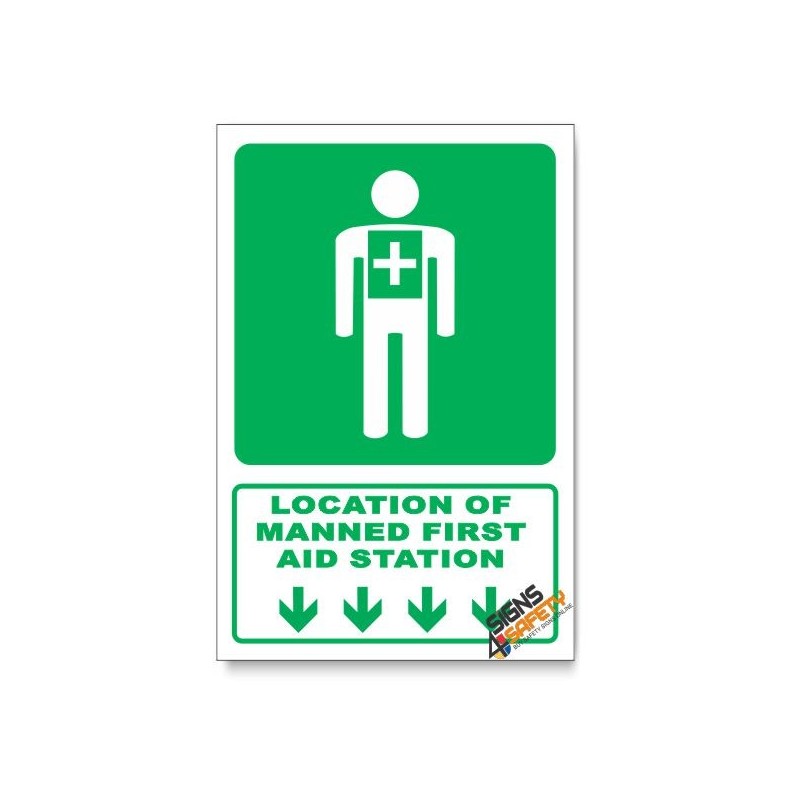 (GA5/D1) Manned First Aid Station Sign, Arrow Down, Descriptive Safety Sign View larger
